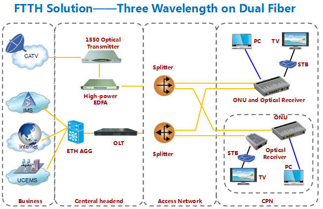 Symmetrical transmission rate of 1.25 Gbps for downlink and uplink Network coverage radius: 20KM;Optical connector: SC/PC High sensitivity optical receiver ≥-26dBm Transmitting power:0~4dBm Security: ONU identification mechanism |